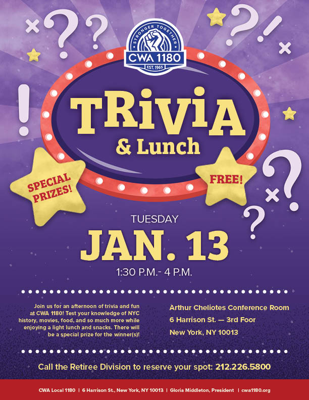 | Tues. 1/27 | IN-PERSON Review of Online Lessons / Q&A | 6 Harrison St. Call the Retiree Division to reserve your spot today: 212.226.5800 |