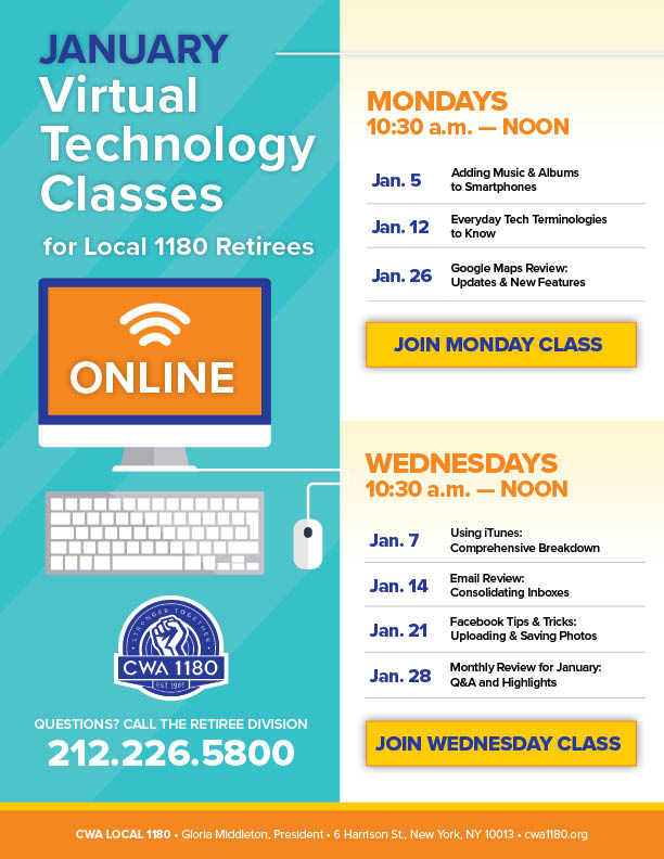 | Tues. 1/13 | IN-PERSON Review of Online Lessons / Q&A | 6 Harrison St. Call the Retiree Division to reserve your spot today: 212.226.5800 |